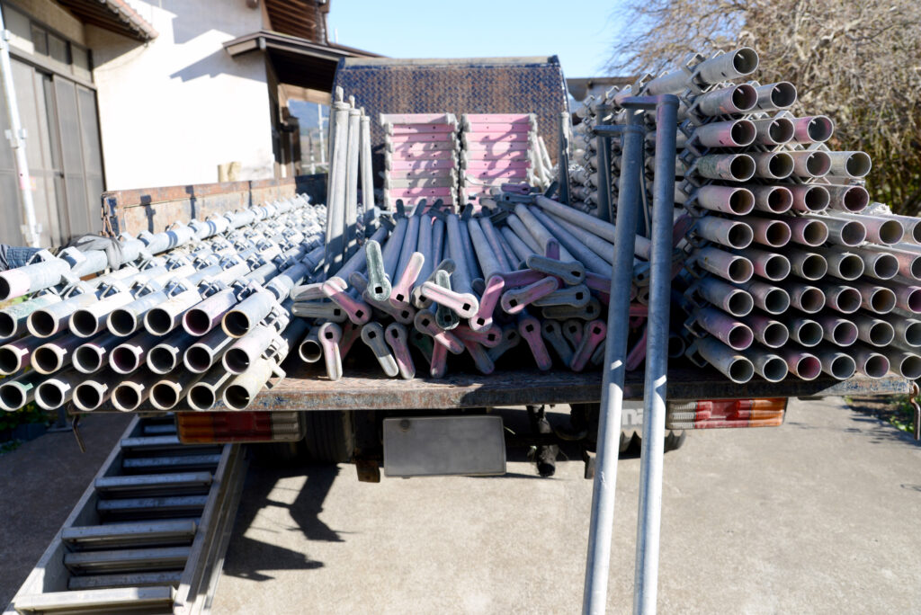 足場の資材置き場から部材をトラックに載せ、現場に運搬します。